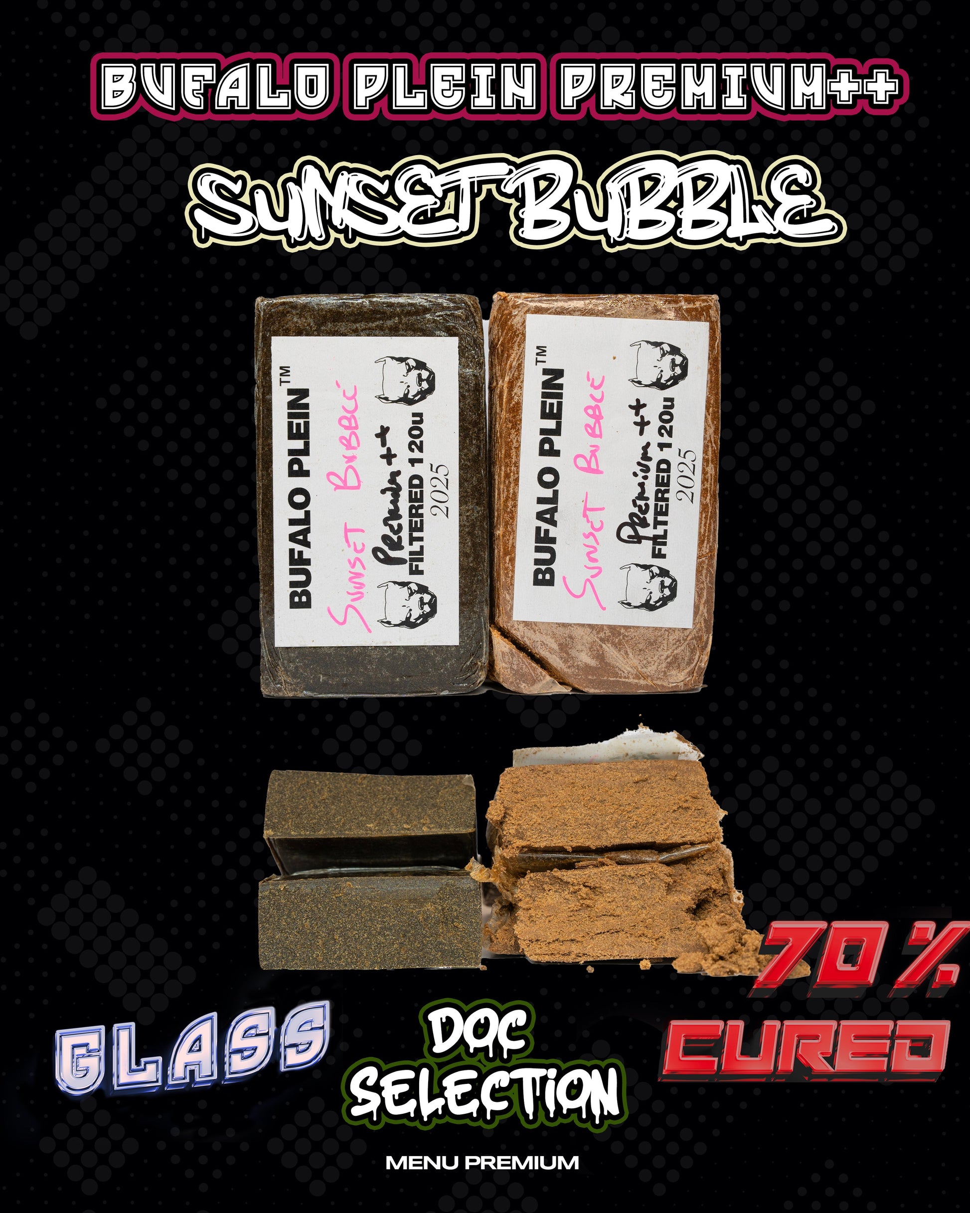 ย Filtrato 120u PREMIUM con formatoย  da 100gr By Bufalo Plein, ricavato dalle polveri dello strain Sunset Bubble, rappresenta una scelta eccellente per chi cerca un filtrato premium di qualitร  superiore alle card da lavoro mantenendo sempre e comunqueย  un ottimo rapporto qualitร /prezzo By Bufalo Plein, volevo precisare che testando questo hash mi son sentito di paragonarlo a un frozen mid in livello di terpene e high durante la fumata!